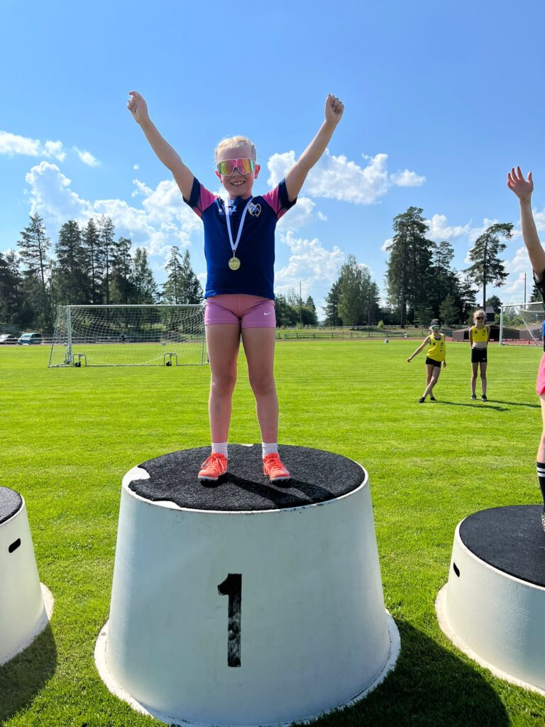 Usva Oksanen iloitsee 150m voittajana Iitissä. Usva on kehittynyt kauden aikana hienosti useissa lajeissa. Kuva: Riikka Talja